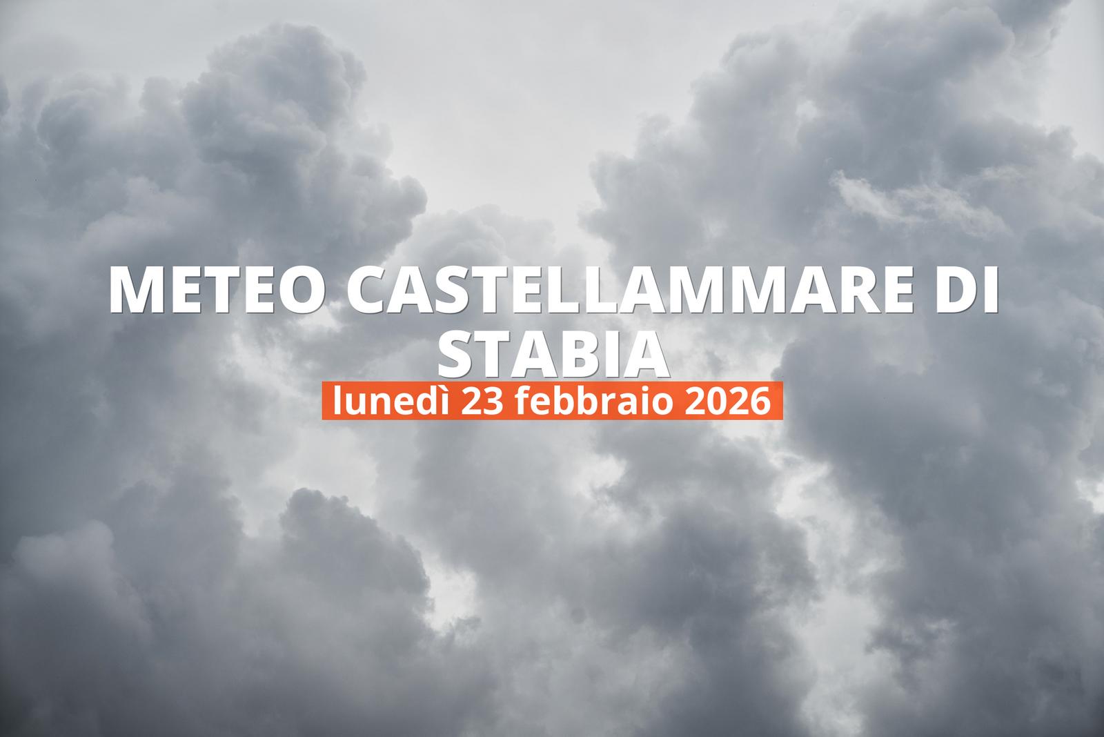 Meteo oggi a Castellammare di Stabia - riepilogo della giornata (lunedì 23 febbraio 2026) Lunedì a Castellammare di Stabia sarà piuttosto fresco. Nel momento più caldo della giornata, intorno alle 13:00, i termometri segneranno 15°C. La temperatura minima si registrerà intorno alle 5:00 e sarà di 9°C.