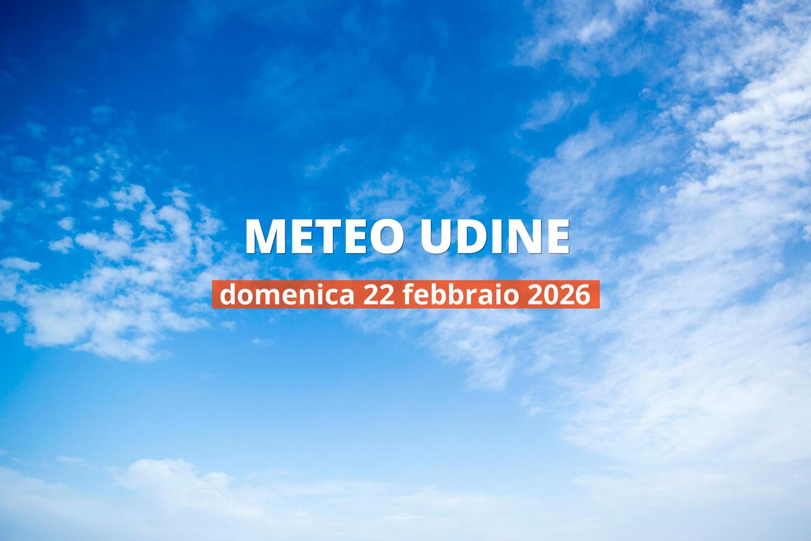 Udine - bollettino meteo di oggi (domenica 22/02/2026) Domenica a Udine si preannuncia fresco. Nel momento più caldo della giornata, intorno alle 14:00, i termometri segneranno 13°C. La temperatura minima si registrerà intorno alle 5:00 e sarà di 1°C.