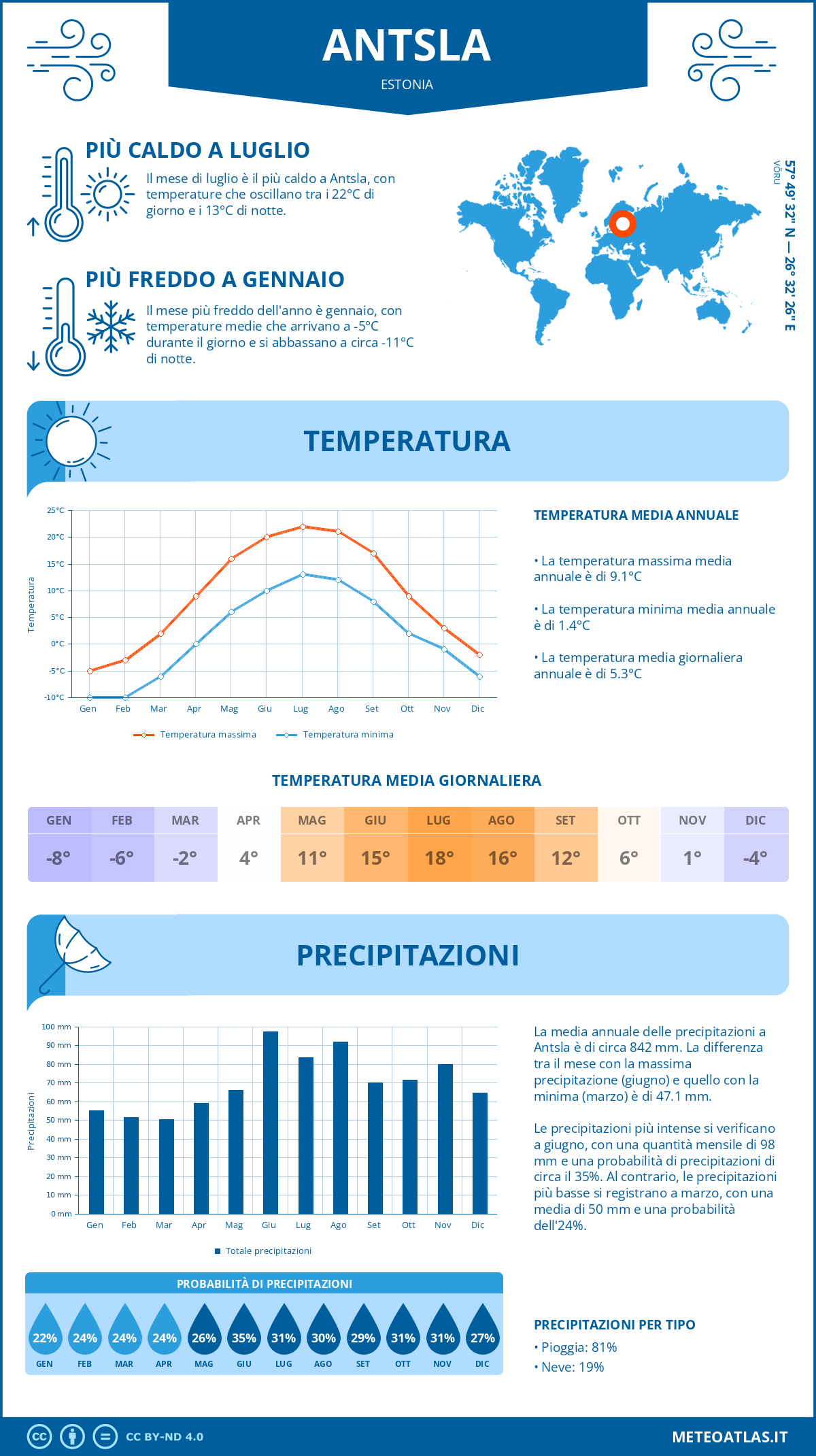 Il periodo più caldo ad Antsla comprende, tra gli altri, mesi come luglio, con temperature diurne medie di 22°C e temperature notturne di 13°C. Per contro, il periodo più freddo dell’anno include mesi come gennaio, con temperature diurne medie di -5°C e temperature notturne di circa -11°C.