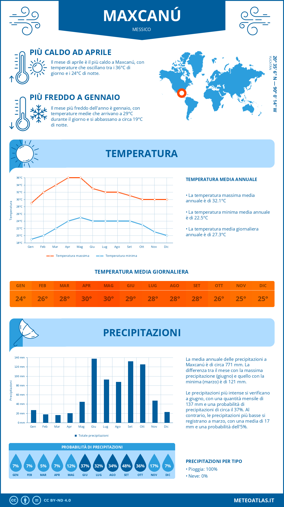 Il periodo più caldo a Maxcanú comprende, tra gli altri, mesi come aprile e maggio, con temperature diurne medie di 36°C e temperature notturne di 24°C. Per contro, il periodo più freddo dell’anno include mesi come gennaio, con temperature diurne medie di 29°C e temperature notturne di circa 19°C.